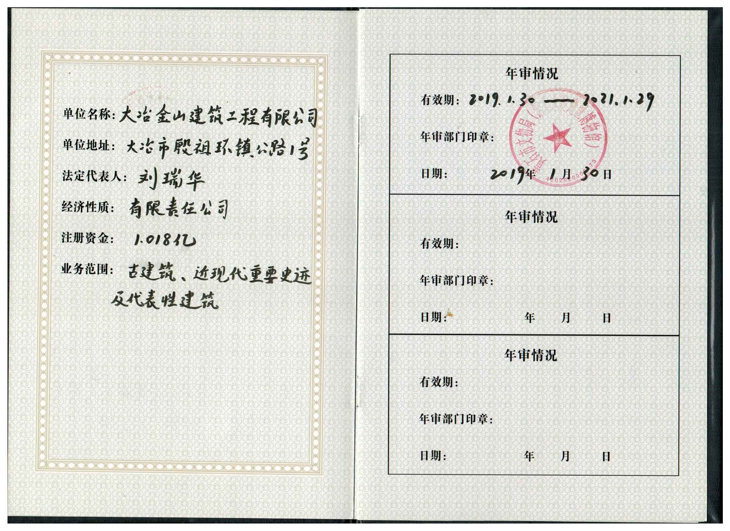 大冶金山建筑工程有限公司始建于1984年,屬鎮(zhèn)辦集體企業(yè)。1997年改制為大冶山建筑工程有限責任公司,屬股份制企業(yè)。2013年更名為大冶金山建筑工程有限公司,2018年3月公司資源重組,公司注冊資金達到10180.00萬元,公司法定代表人為劉瑞華。公司具有古建筑工程專業(yè)承包壹級、建筑工程施工總承包貳級、市政工程總承包叁級、鋼結構工程專業(yè)承包叁級資質。